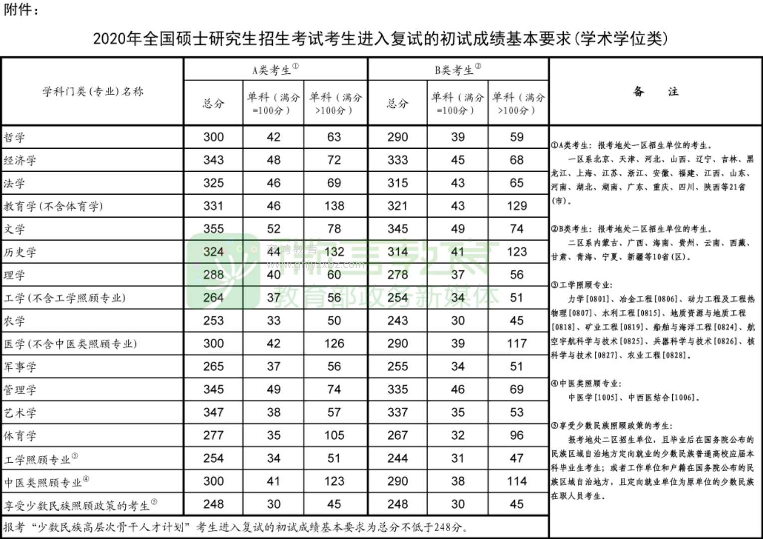 2020年全国硕士研究生招生考试考生进入复试的初试成绩基本要求(学术学位类,专业学位类)